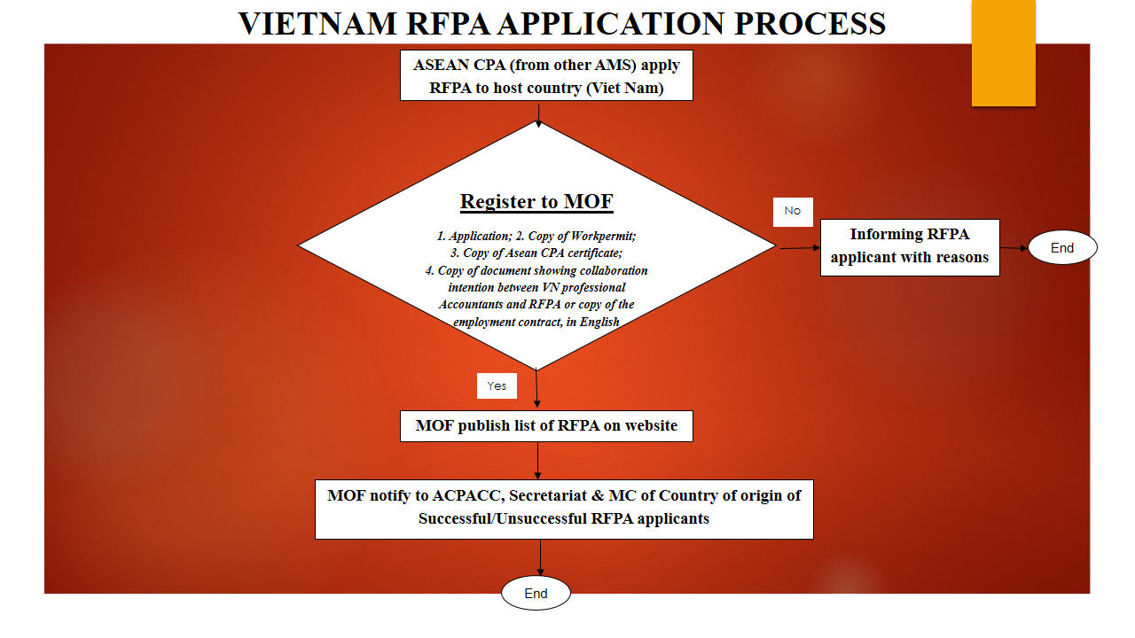 - Vietnamese certified public accountants who have CPA certificate awarded by the Minister of Finance but are not working in the independent auditing organisations in Viet Nam and wish to join VACPA as full members.